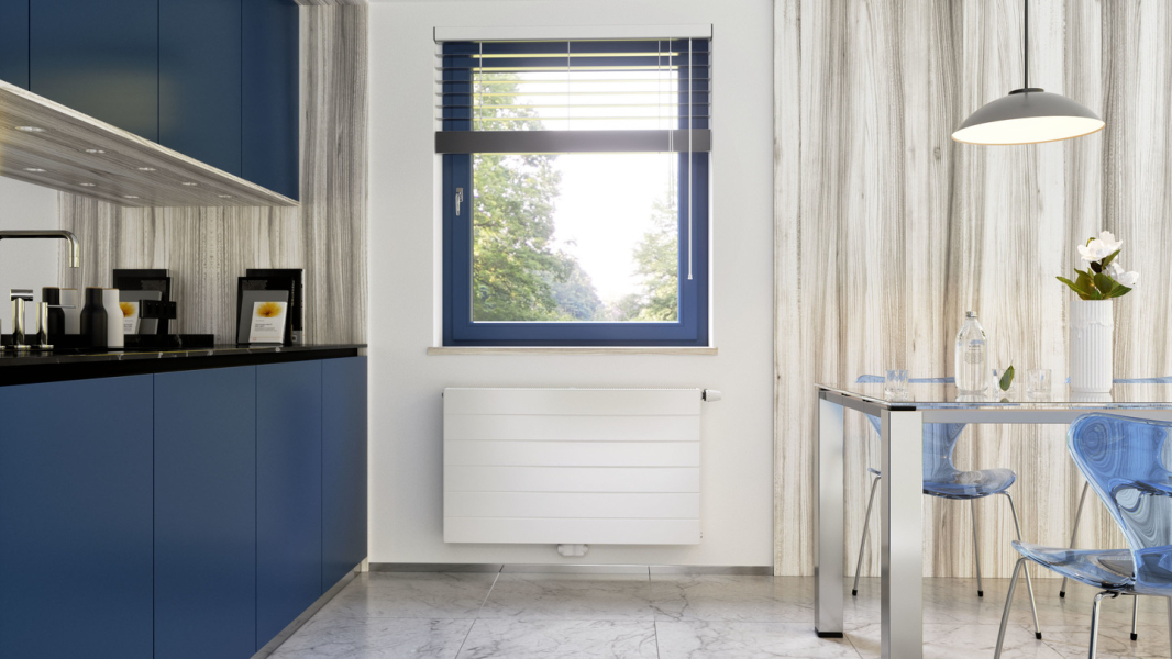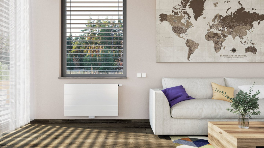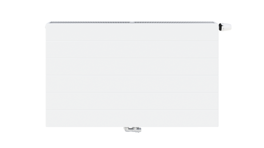 Deskové otopné těleso s hladkou čelní deskou s jemnými horizontálními prolisy a univerzálním připojením