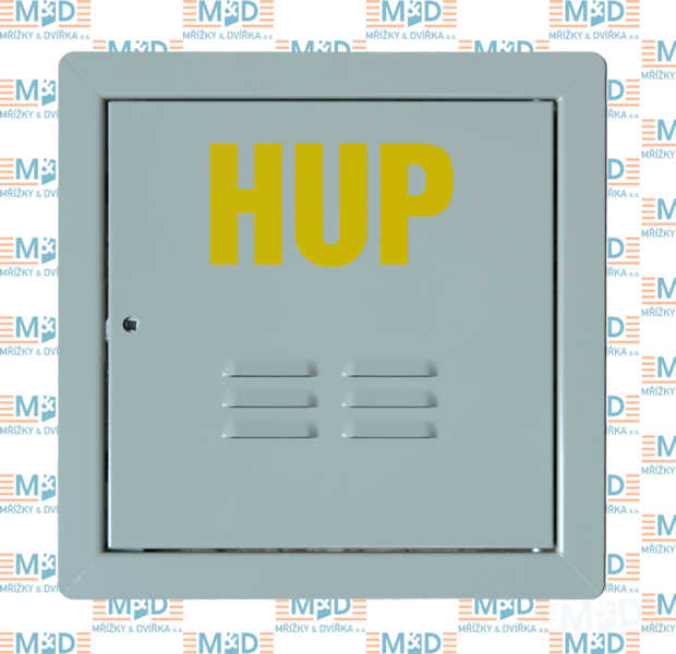 Revizní dvířka plynoměru z šedého pozinkovaného plechu s informačním označením HUP (samolepka přiložena).