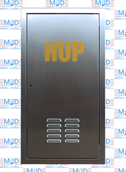 Revizní dvířka plynoměru z nerezového plechu s informačním označením HUP (samolepka přiložena).