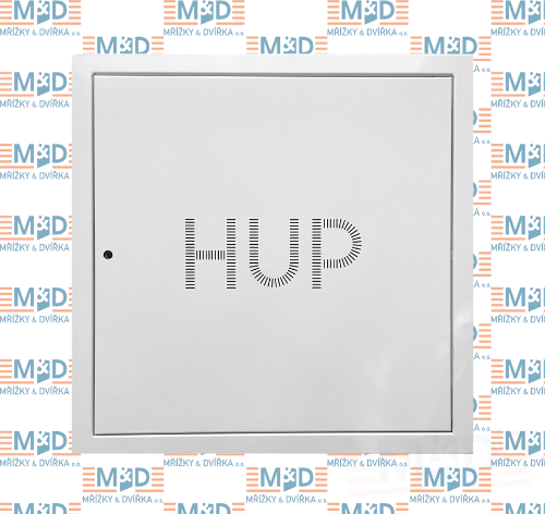 Revizní dvířka plynoměru z pozinkovaného plechu s vysekaným označením HUP, které zároveň plní funkci přirozeného odvětrávání.