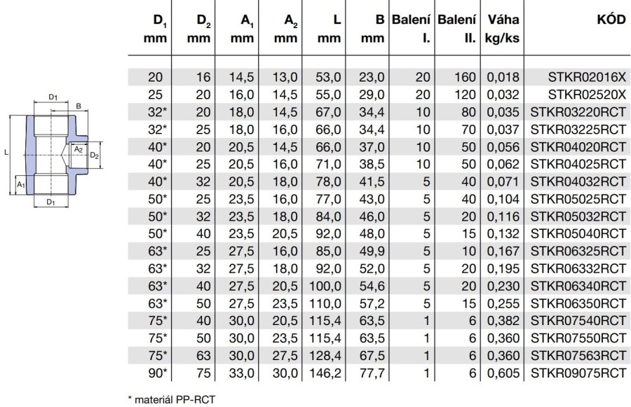 WAVIN EKOPLASTIK PPR T-kus 32x20x32mm, redukovaný, svařovací, voda, PP-R